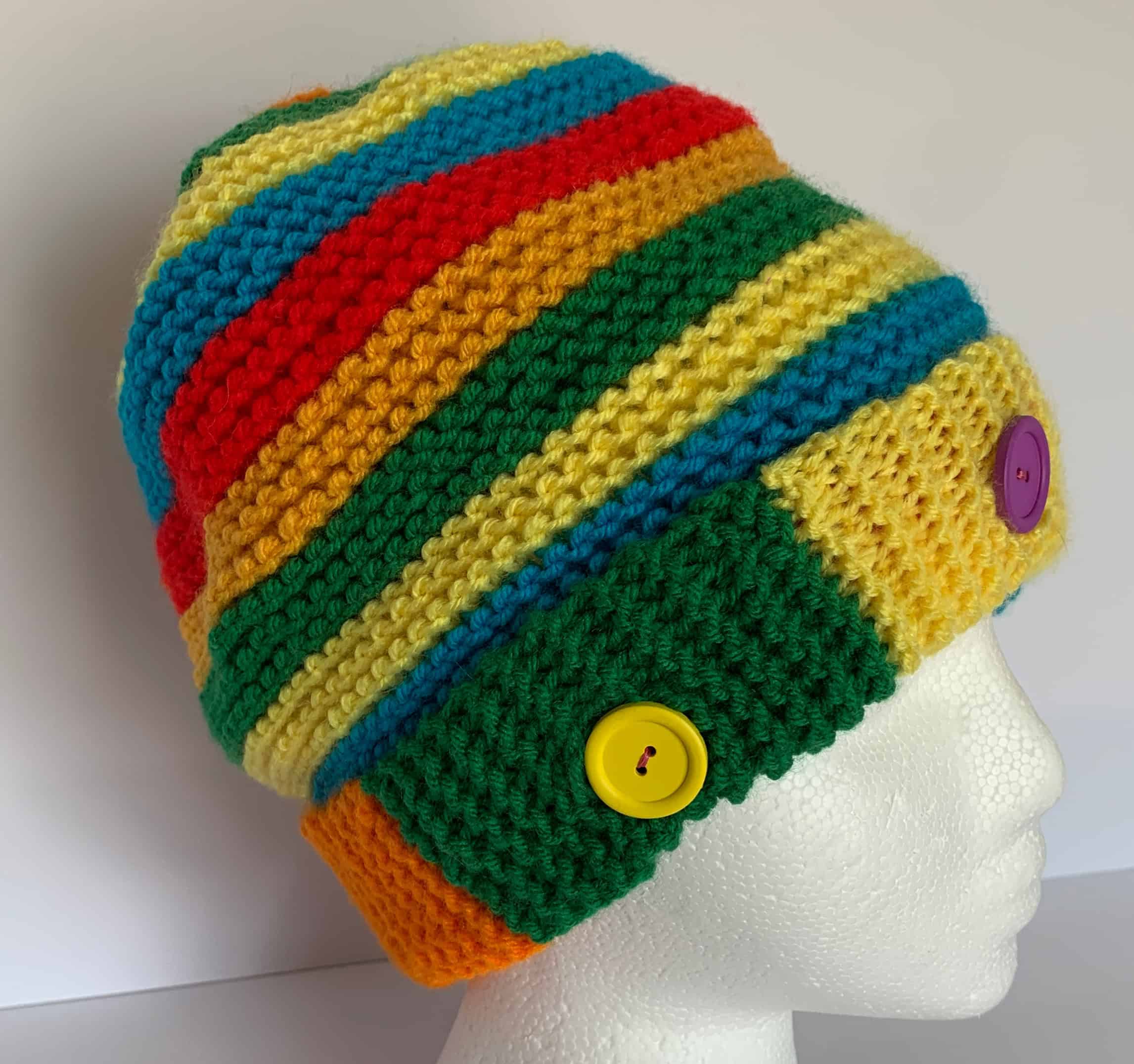 A fun hat to wear for kids to adults! Gather up the large mis-matched buttons, some scrap yarns and you have enough to start making this cute hat! You can button 2 buttons in front and let back unbuttoned to cover back of neck. What a great gift idea for just about anyone. This is so much fun to knit that you may want to make more than one! Children to teens love this, make in bright colors for fun Winter wear! Worsted weight yarn, knitting needles, US # 9.