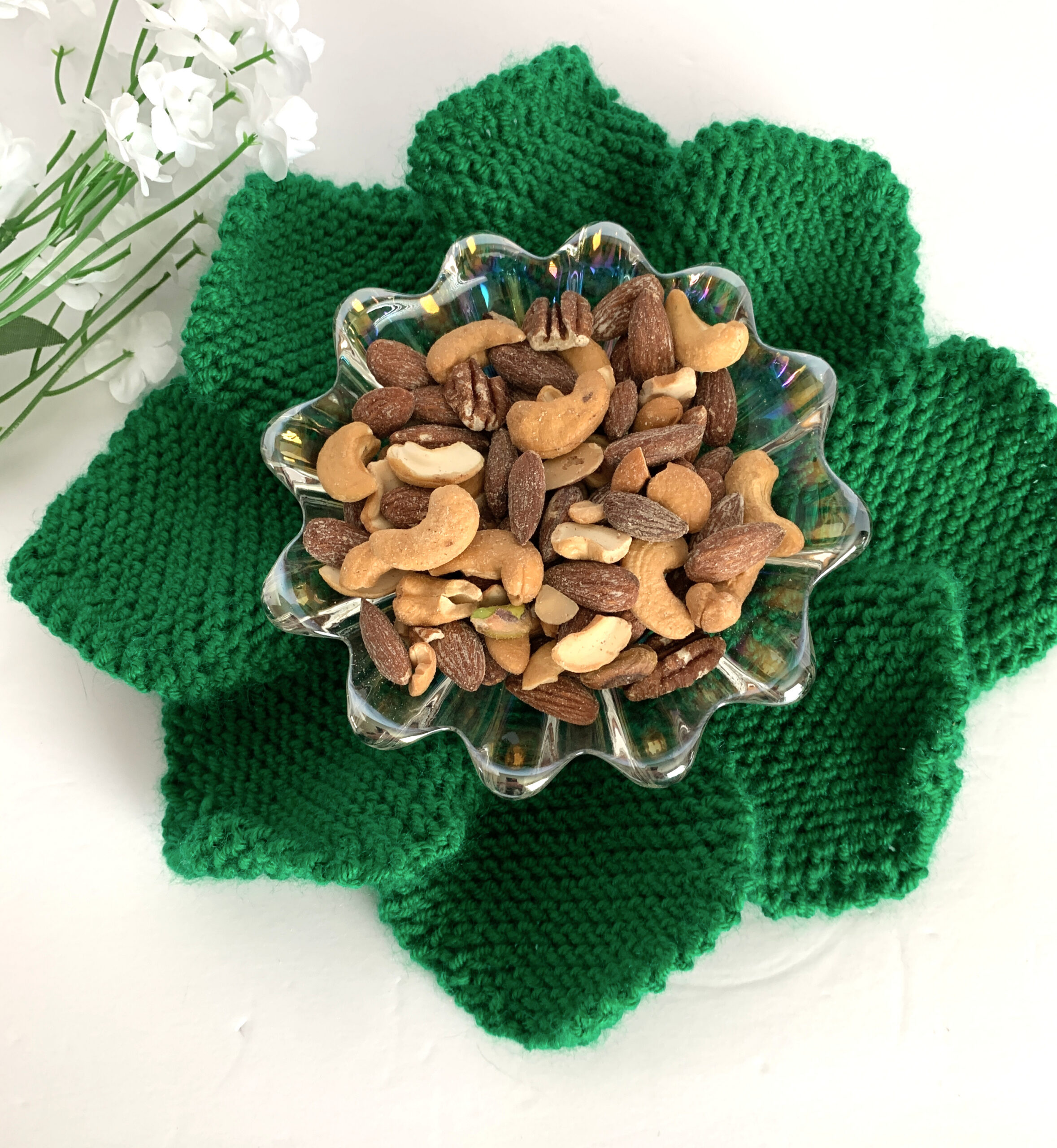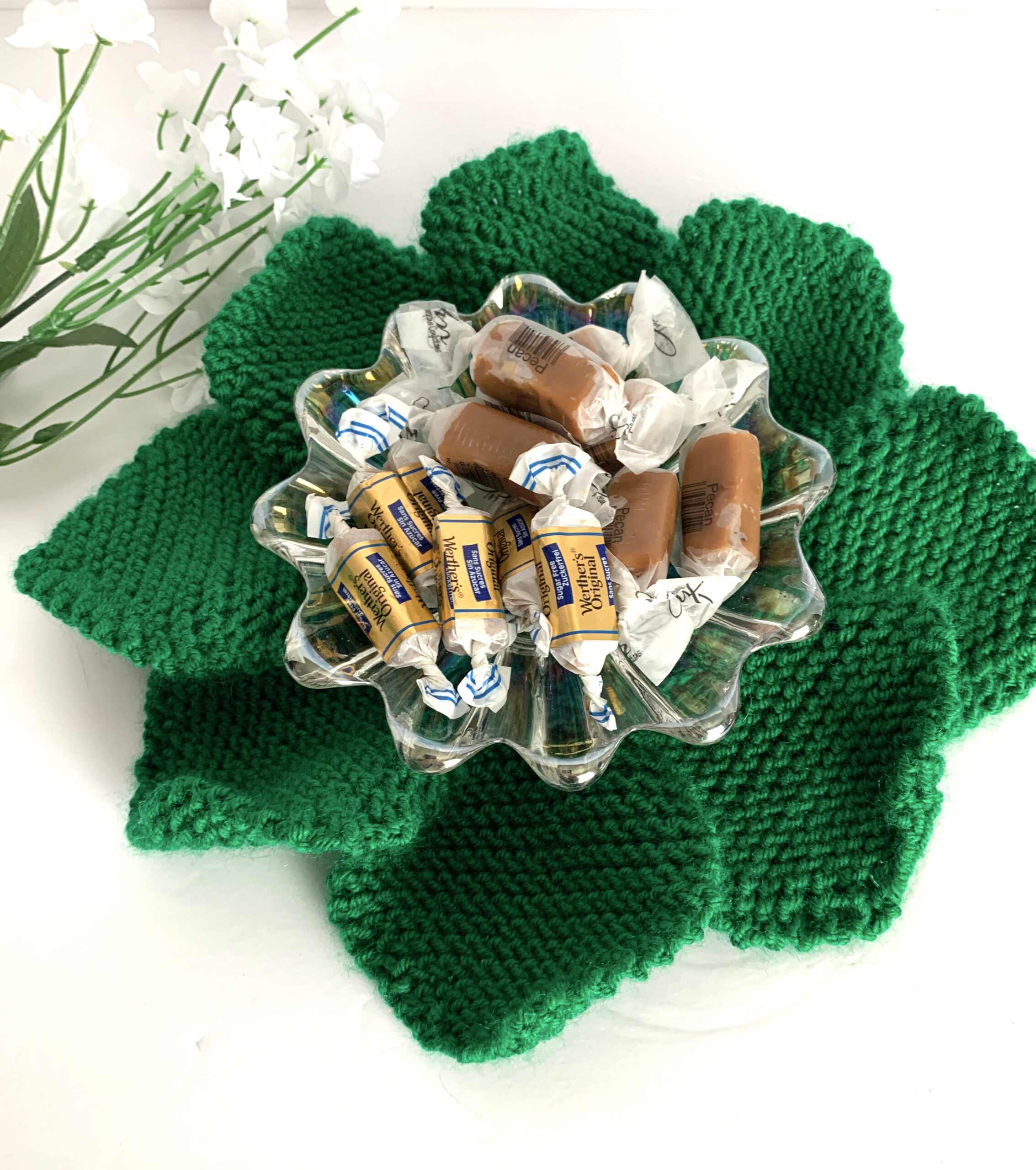 So pretty, so easy to knit! Place a potted planted, candy dish, candle in holder, or decorative dish or bowl in center of this doily and it will make your room much prettier! Knit this in any color, for Easter, Christmas, or any pastel color for Summer, even Fall colors. Change with the Seasons, by knitting more than one of these. We made ours easily in one day, it is that easy! A great 2 needle pattern everyone should have! Worsted weight , size 4 yarn, knitting needles US# 8
