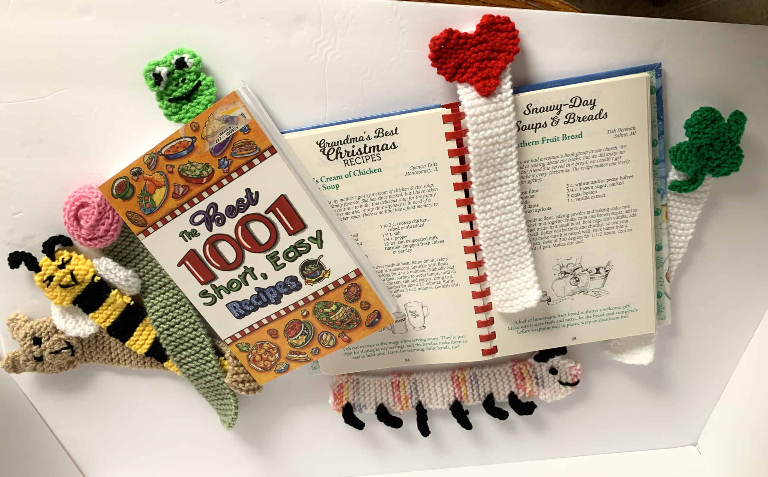 Fun for all ages! These clever designs will mark your spot in your books for when you are ready to go back to them. What a great gift idea, especially for Holiday stocking stuffers! These knit up quickly, so you can make several for a fun birthday gift for children to adults.