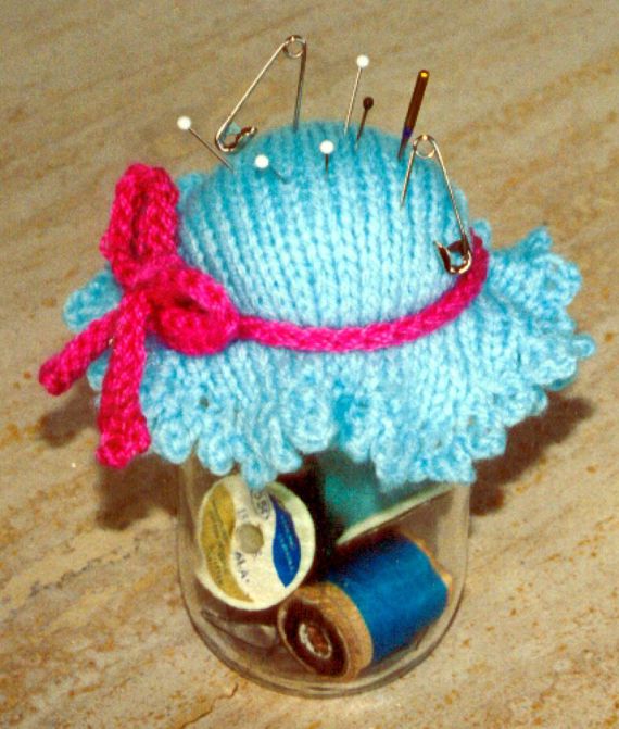 What to do with all those empty jelly jars! Knit up a topper that is so cute, all you sewing and knitting friends will want one! And the good thing is , you will use up scrap yarn, and find a good recycle use for the jar. Ours was used as a pin cushion, with jar as a storage area for pins and needles. You could also store spools of thread in the jar. The jars we used 2 to 2¼in diameter at top. Directions say baby food jars, but we find many store bought jelly jars with the smaller tops work well too. Knit the cover and complete, and buy some great preserves. Put top on and give the gift of preserves and cover in one gift! Uses sport weight yarns, knitting needles, US # 4.