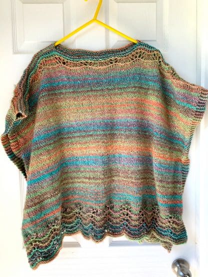 This is a great poncho/wrap to wear just about any time of the year. Make it in your most favorite color and you will be wearing it over and over again. Variegated or tweedy or “stripe-y”, and speckled yarns look great in this pattern stitch too. It is light weight, yet has warmth, free flowing on the body to accommodate just about any body shape. This poncho/ wrap would make a great gift for a friend! It is fairly easy to knit and finish, that you may want to make several in different colors to spark up your wardrobe! We used Caron Blossom Cakes, knitting needles, US # 10