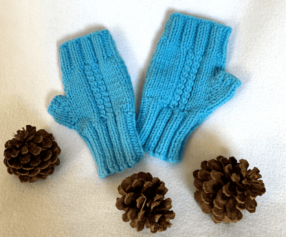 One size fits most. A great idea to wear to keep hands warm, yet your finger tips are free to dial a phone, pick up change, etc. These will knit up quickly too. You can knit the cuff longer if you wish. A super easy “mini cable“ pattern that anyone can knit, is worked on the front of each mitt for a cute design! Note, that this does not require a cable needle! Make lots of these for gifts. Very nice gift for any friend, office partner, neighbors, and make a pair for yourself too! Uses worsted weight yarn, knitting needles one pair US # 8.