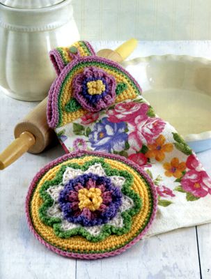 A great selection of “fun” crochet floral designs to brighten up anyone’s kitchen! Make the matching sets for quick gifts too! With a medium weight yarn, and size H crochet hook, you will be able to crochet up lots of these sets in one week! Make a set for the favorite teacher, a new neighbor, or give as hostess gifts and door prizes! Lots of fun and ideas here!
