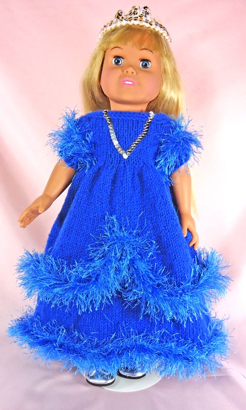 This is the perfect dress for the Holiday ball! Includes directions for crown, and cape/cloak. Every little girl will want her 18 inch doll dressed in this on Christmas Day! Use sport weight yarns, fur yarn, worsted yarns and sequins. Knitting needles US sizes 6 and 7. Put this dress on the doll, place under the Christmas tree, for smiles on cute little faces! Easy directions to make authentic looking crown included!